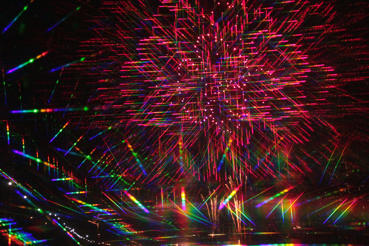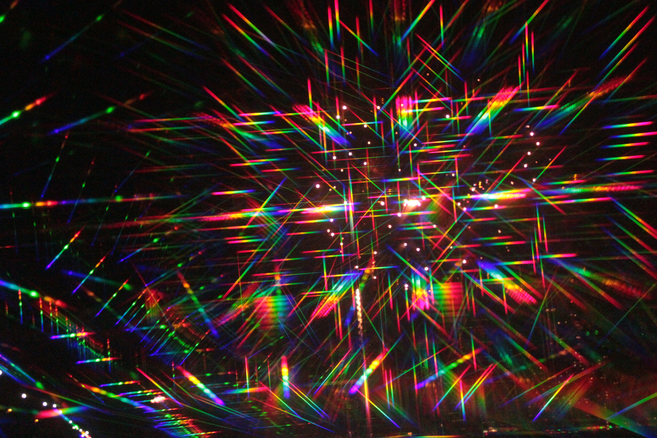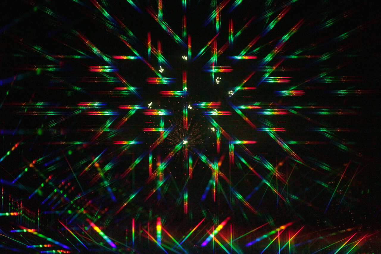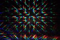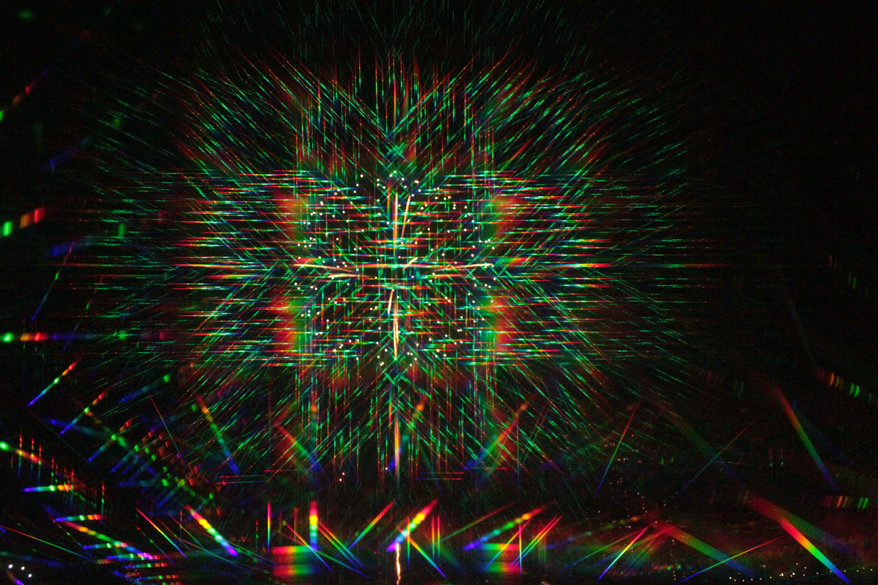 こちらでご紹介するペーパーメガネは、回折格子フィルターを使った「花火メガネ(Fireworks Glasses)」です。このメガネをかけて花火やクリスマスツリーのイルミネーション、夜景の灯かりなど点光源を見ますと、その周りに虹色の閃光(スペクトル)が縦横に反復して発生し、大変面白い視覚効果をお楽しみになれます。