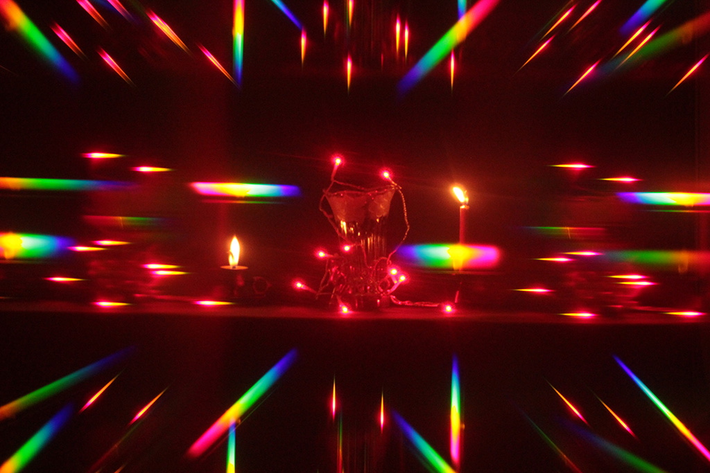 * 写真上段左は赤のLED(中央)とロウソクの火(両脇)を見たときの見え方。他は花火を見たときの効果。