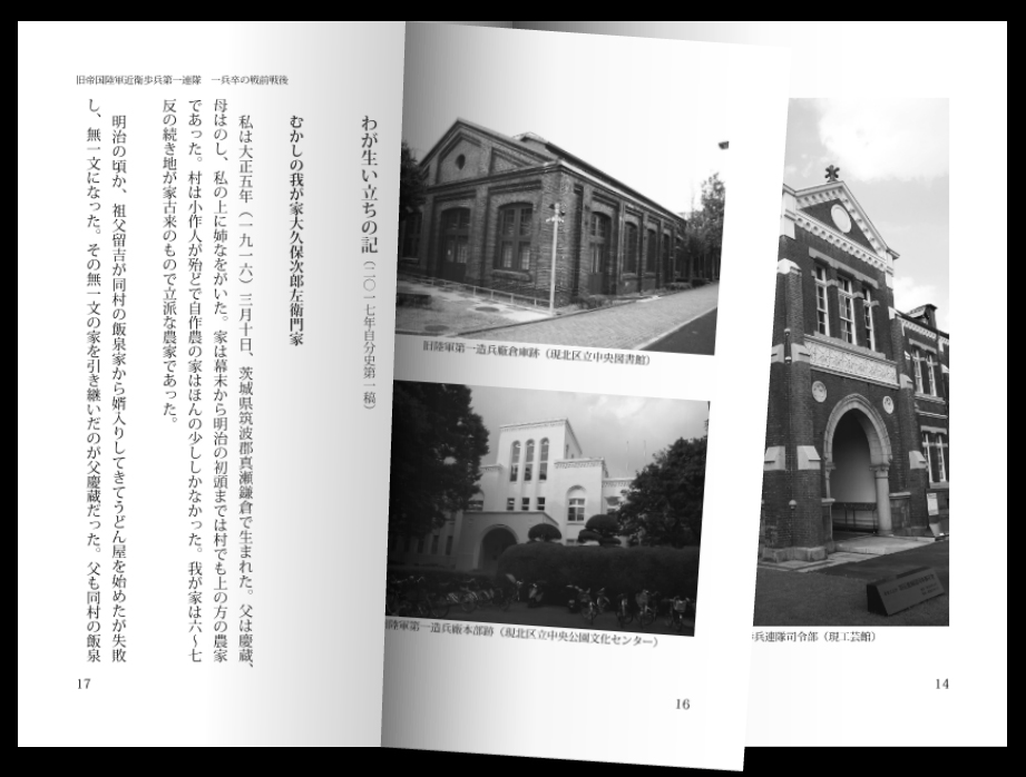 私はこの春、百歳の誕生日を迎え、大勢の方々に祝っていただいた。普通、百歳にもなればあちこち躰の不具合を感じるものであるが、私の場合、不自由なのは耳と足だけで他はどこも痛くもなければ痒いわけでもない。眼もよく見えて本も読めるし、頭のぼけもない。生まれつき躰の方はそれほど丈夫ではなかったが、有難いことにここへきて益々意気軒高な日々を送っている。そういうわけで、ここ数年は、「真瀬霧が丘の生成について」と題し、わが村真瀬にみられる幾つかの丘状地形に関する地学的研究に傾注しているわけであるが、その研究に加え、戦前、私が徴兵検査後旧陸軍の近衛歩兵連隊に赴任した当時の話をまとめておいて欲しいという話が誕生祝いの席でもちあがった。私は、これまで村の昔話や農業については色々書くことはあっても自分自身について述べることは滅多になかった。というよりも特に先の戦争当時のことについてはほとんど人に話すこともなかった。そこで私もこの先長生きしたにしてもせいぜい十年かそこいらだろうと思うこともあり、この際、私のおいたちを含め、先の戦争前後の事を書き留めておくこともそう無駄にはなるまいと思って筆をとった。それが本書『旧帝国陸軍近衛歩兵第一連隊、一兵卒の戦前戦後』 で、二十歳の時の徴兵検査、近衛歩兵第一聯隊、淵野辺の陸軍工科学校、王子の陸軍東京第一工廠を経て仙台苦竹の陸軍工廠で終戦を迎えた頃までことを書いた。もう八十年以上も昔のことなので極めて断片的なものでしかないが思い出せれるだけ頑張って書いた。床で横になりながらの執筆になったので自分でも後で読めないほどの乱筆になった。編集を引き受けてくれたのは今は亡き姉なをの次男で甥の武雄だった。ミミズが這うような手書きの原稿をよく解読して本にしてくれたものだと感謝である。なお、本書には付録として筑波台地研究『真瀬霧が丘の生成について』、常陽新聞社平成八年度つくば提言大賞作品『つくば市農業の未来を考える』、『天領真瀬の栄光と没落』などを添えた。あわせて読んでいただければ幸いである。著者