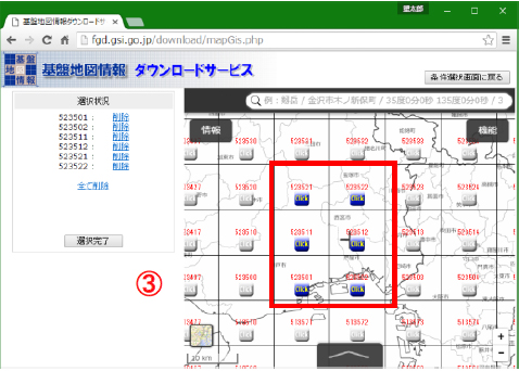 ③ ダウンロードを希望する範囲をクリックで選択し,データをディスクトップ等へダウンロードし解凍・保存する.