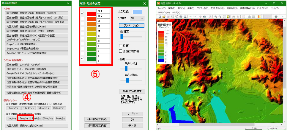 ④ 地図太郎ソフトウェアを起動し,データ(背景地図)の読み込み →「10m メッシュ」を選択しクリックする.