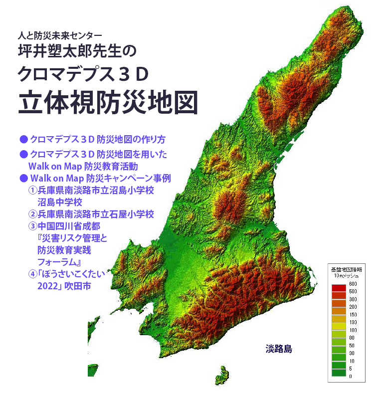 (公)ひょうご震災記念21世紀研究機構人と防災未来センター主任研究員の坪井塑太郎先生が、近年、地域防災力向上を目的とする取組みのひとつとして、自治体・学校の連携による立体地図を用いた防災のための啓蒙活動を行っています。本取組みでは、災害対応の前にまず自身の地域を知ることを重視し、「高低を体感する」ための立体地図作成を目的として、自治体に対してはGISを用いた標高地形図の作成に資する技術支援を、児童・生徒含む参加者に対しては3D立体メガネを用いて地図の上を「歩き」、「見て」、地域を考える場を提供しています。ここでその上を歩ける立体地図を作成するにあたっては、印刷が可能な3D形式としては一般には赤シアンメガネを使用するアナグリフ形式が用いられてきましたが、坪井先生のは、色相によって奥行きの変化を感じ取れるクロマデプス方式を採用しています。そこで本サイトでは、クロマデプスによる立体防災地図の作り方、ならびにその活用事例としてこれまで各地で実施された