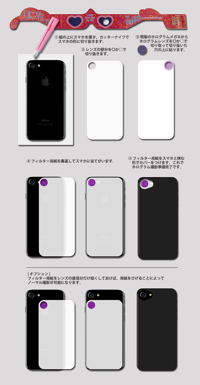 ホログラム・メガネで見える情景をスマホで撮影したい。そんなニーズにお答えするため、ホログラムメガネのレンズを使った簡単なスマホ用ホログラム・フィルターのつくり方を下図でご紹介します。詳しくは弊社あてお問い合わせください。Tel:044-863-9545。
