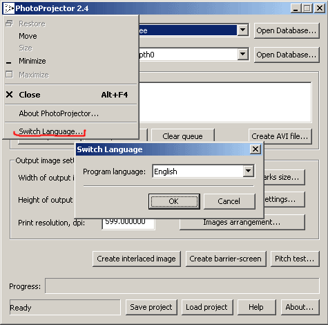 Нажмите на значок в левом верхнем углу, появится системное меню, выберите Switch Language... - появится диалог выбора языка. Выберите Russian, нажмите O.K. Язык сменится только после повторного запуска программы, закройте программу и запустите ее снова. |
