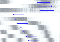 Черные сгущения и белые разреженные области возникают из-за биения частот. Теперь закрываете один глаз, поворачиваете голову влево-вправо и смотрите, как бежит муар. Среди полосок есть две полоски, где муар бежит НАВСТРЕЧУ друг другу: верхний муар - слева-направо, нижний - справа-налево (и наоборот). Направление движения муара меняет знак. Вот эти две полоски нам и нужны. Частота нашего растра лежит между ними.