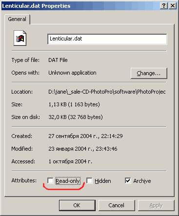 НеполадкиНе загружайте сжатые и многослойные TIF-файлы. Программа не может содавать файлы больших размеров, более 950 МВ. Если вы не можете сохранить изменения в базе данных линзовых растров или типов изображений, измените статус файлов Image.dat и Lenticular.dat. Выделите файлы, нажмите на правую кнопку мыши, выберите Properties (Свойства).