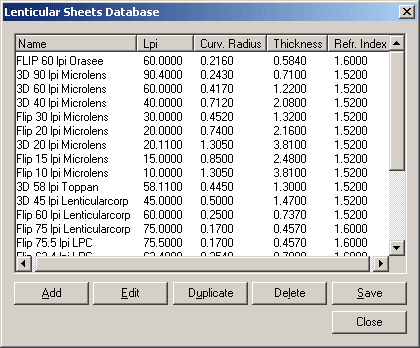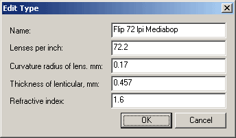 Здесь можно добавить (Add), отредактировать (Edit), скопировать (Dublicate) и удалить (Delete) записи. При нажатии кнопки Save все изменения записыватся в базу данных. Таким образом вы создаете свою собственную базу данных линзовых растров. При нажатии кнопки Add или Edit появляется диалог редактирования. Здесь задаются параметры линзового растра.