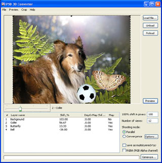 「PSD 3D Converter」は、フォトショップの2D画像をレンチキュラー用にも使えるマルチビューポイントの3D画像に変換するためのソフトウェアです。2D/3D変換は、もちろんフォトショップだけでもレイヤ−分けした部分を少しづつ左右にずらすことによっても実現可能ですが、本ソフトウェアは、フォトショップ画像の各レイヤーのマスクで指定されたきめの細かいデプスマップ(奥行き情報)をもとに、複数のビューポイント(視点)から見た画像を複数枚、自動的に生成します。処理できるPSD画像は最大20,000x20,000画素。その際は2GB以上のメモリーが必要となります。