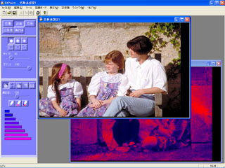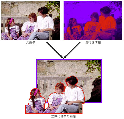 作業工程としては、デジタルカメラやスキャナー等から取り込んだ元画像のファイルをStPaint に読み込みます。読み込まれた平面画像は、左と右のステレオ画像として処理されます。その画像に対して、奥行き情報を付加することにより立体的な画像を生成することが可能となります。