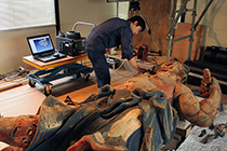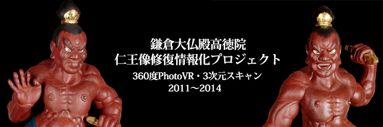 こうしてまずは高徳院裏の仮設作業場に装置を運び込み、修復前の撮影を試みようとした。が、修復前に関しては残念ながら仁王像の状態が二体とも予想以上にひどく、脚まわりの損傷も激しくて作業場で立たせることもままならなかった。従って修復前については回転撮影はあきらめ、御像を床に寝せたままスチル撮影と三次元計測をするにとどめた。このときのスチル撮影はスティッチングソフトで全身をつなぎ合わせて全身像の復元を試みた。