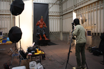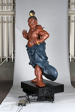 修復後の撮影は、あの大雪の降った後の2月17日から3日をかけ、横浜の日通倉庫で行われた。縦横10mx15m、高さ10mほどの撮影スタジオとしては十分すぎる広さだった。撮影当日、その一画に養生を施された仁王像二体が鎌倉から運びこまれ、われわれの到着を待っていた。300キロもの文化財を回転撮影するのは初めての試みであったため、撮影は、御像を回転台に載せるところから心配であった。理屈では1トンまで耐えられる回転台ではあったが、実際、載せてみたら台座そのものがつぶれてしまうことも全くありえないことではない。また、回してみたらステッピングモーターが悲鳴をあげて煙が出てくることもなくはない。と、とにかく心配の種がつきなかったが、実際の結果は上々だった。300キロの御像は、日通スタッフの手馴れた作業でらくらくと回転台に載せられ、ステッピングモータもいつもの快音を発しながらなんなく回転し、通常のAutoQTVR撮影となんら変わりなく進めることができた。
