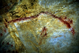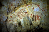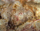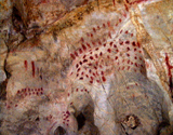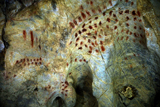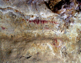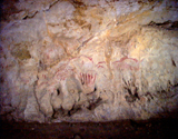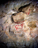 This is a view of the central part of the caveÍs main panel of paintings. It shows a series of dots (PD006), a series of claviforms (PD008), similar to the ones in Cueva de la Cullalvera (Cantabria) and others in L'Ariege(Fontanet), a wounded bison that is painted and engraved (PD009), and a horseÍs head (PD010) facing the previous figure.