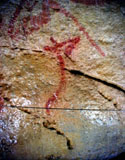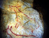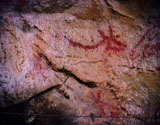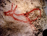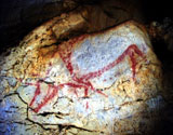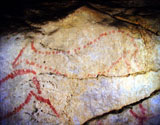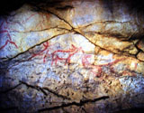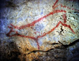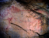 This panel is located at the back of the decorated area, on the right hand wall. Its center is occupied by a large figure of a horse. It is practically whole, with numerous details such as the nostril, eye and mane, depicted with several parallel lines of dots. Also note the hooves on its rear legs, with a rounded shape as usually occurs in pre-Magdalenian art. As many as five small figures of hinds surround the horse. They are less complete figures, normally reduced to the head and the cervical-dorsal line.