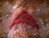 This bison shows some quite archaic pictorial conventions, such as having only one fore and rear limb or the twisted perspective of its horns. Nevertheless, its proportions and numerous details included, like the hooves, genitals, eye, beard and spear in its back, mean this figure is probably of Magdalenian age. Its superimposition on the claviform signs supports this idea.