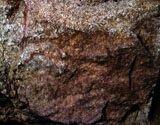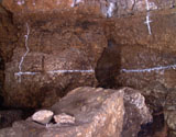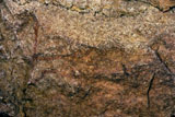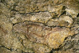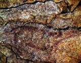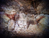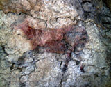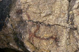 This large figure of a hind facing right was painted in red with different techniques: overlapping dots, continuous lines in its limbs, and color wash in its head and neck. It is a whole figure, with head, V shaped ears, cervical-dorsal line, tail, rear limbs, belly, fore limbs and chest. A figure of a horse facing left (PE011_1J) is painted in front of the hind.