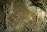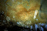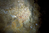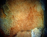 This is a figure of a hind facing right. It is outlined with a line of paint, and filled with a color wash in the same yellowish brown tone. Its head can be seen with two long ears, cervical-dorsal line, belly and chest. But the limbs do not appear to be depicted. This hind is situated between places where part of the wall has fallen off, and patches of calcite. It is paired with another hind facing in the opposite direction (PN003).