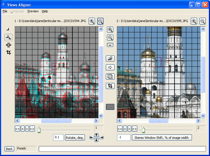 「ViewsAligner」は、立てずれ、回転、過度な水平視差、倍率の違いなどマルチビューのステレオ写真に起こりがちのフレーム間のズレを自動的に修正するためのソフトウェアです。修正されたマルチビュー画像は、使用するレンチキュラー板のピッチにあわせてインターレース化することもできます。