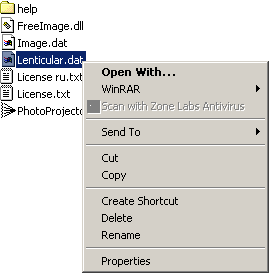 НеполадкиНе загружайте сжатые и многослойные TIF-файлы. Программа не может содавать файлы больших размеров, более 950 МВ. Если вы не можете сохранить изменения в базе данных линзовых растров или типов изображений, измените статус файлов Image.dat и Lenticular.dat. Выделите файлы, нажмите на правую кнопку мыши, выберите Properties (Свойства).