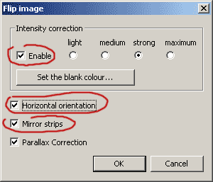 Далее задаем размеры конечного изображения в сантиметрах. Потом устанавливаем разрешение печати, лучше всего поставить разрешение печати принтера. Mark size... - размеры рисок по краям, Images arrangement... - дублирование картинок на странице. Type = Flip, далее жмем Settings.... Выбираем Horizontal orientation, если мы будем крутить вариокартинку вверх-вниз. Выбираем Mirror strip - зеркальное отражение полос (линзы переворачивают изображение). Parallax correction можно отключить, это не важно для маленьких вариокартинок. Нужно или не нужно включать Intensity correction (Поправка насыщенноси), покажет опыт. Вначале рекомендуется ее отключить и попробовать сделать варио без нее. Затем попробовать Intensity correction (Поправка насыщенноси). При этих настройках будут создаваться разделительные полосы переменной толщины. Степени light, medium, strong, maximum связаны с растеканием чернил и шириной разделительных полос. Для maximum разделительные полосы будут самыми широкими.
