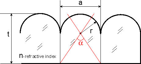 Характеристики растра: a - период растра, t - толщина растра, r - радиус кривизны растра, n - показатель преломления, α - угол обзора Часто растры имеют маркировку 3D Lenses или Flip Lenses. Что это значит. Рабочая область линзы V-образна и ограничивается неким углом - углом обзора α. V-образная рабочая область линзы Это угол, в пределах которого мы видим нормальный стереоэффект и один цикл анимации. Если мы повернем линзу на угол, больший этого угла, мы увидим псевдоскопическое изображение (левое и правое изображение поменялись местами) или следующий цикл анимации для вариокартинок. Этот угол лежит в пределах от 24 до 60 градусов. Угол, больший 60 градусов, сделать нельзя - это ограничение связано с показателем преломления полимерных материалов, из которых сделаны линзы. Если бы могли сделать линзовый растр из хрусталя (показатель преломления около 2), то угловой обзор такого растра мог быть 90 градусов. Если мы положим полосовое изображение под линзу с маленьким углом - 24 градуса - стереоракурсы соберутся в маленький угловой конус и глубина стереоизображения будет довольно большой. Если мы положим ту же самую полосовую картинку под 60-градусный линзовый растр, глубина стереоизображения уменьшится в два раза. Поэтому линзовые растры с угловым обзором 24-30 градусов предназначены в основном для стереоизображений и имеют маркировку 3D Lenses, а линзовые растры с углом 45-60 градусов - для вариоизображений - Flip Lenses. Конечно, это деление условное. Flip-растры можно использовать для создания стерео с большим углом обзора (wide stereo). А 3D-растры для создания вариоизображений с быстрой сменой кадров (quick flip) 3D Lenses и Flip Lenses имеют разные профили. Посмотрите на рисунок снизу. Он вам поможет отличить один тип линзового растра от другого. 3D и Flip линзы |