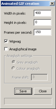 В окнах Width и Height задается размер кадров в пикселях, в окне Frames per second - частота кадров. При включенном Wigwag создается зацикленный файл. Включив Anaglyphical image вы можете создать анаглифный видеоролик, который просмтривается сквозь цветные стереоочки. Grey anaglyph - для создания обесцвеченного анаглифа, Colour anaglyph - для окрашенного анаглифа. Frame shift задает сдвиг между кадрами, которые образуют стереопару. Например, задав Frame shift = 3, вы будете создавать анаглифы из первого и четвертого кадров, второго и пятого и так далее. При нажатии кнопки Save создается gif-файл. |