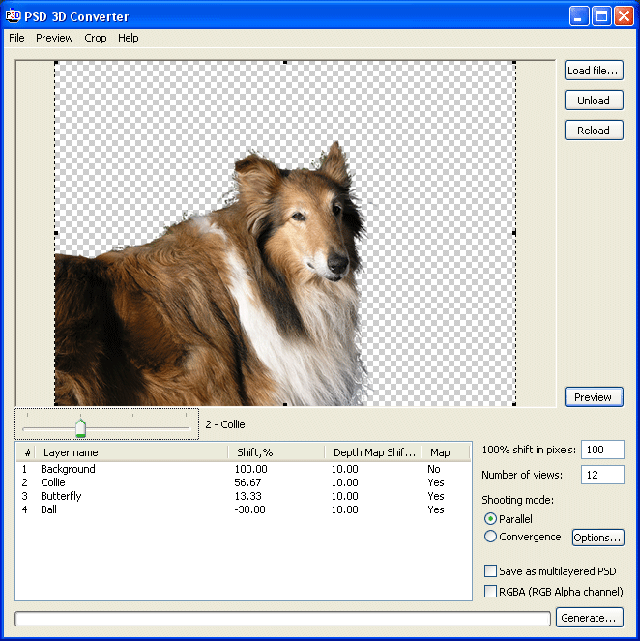 「PSD 3D Converter」は、フォトショップの2D画像をレンチキュラー用にも使えるマルチビューポイントの3D画像に変換するためのソフトウェアです。2D/3D変換は、もちろんフォトショップだけでもレイヤ−分けした部分を少しづつ左右にずらすことによっても実現可能ですが、本ソフトウェアは、フォトショップ画像の各レイヤーのマスクで指定されたきめの細かいデプスマップ(奥行き情報)をもとに、複数のビューポイント(視点)から見た画像を複数枚、自動的に生成します。処理できるPSD画像は最大20,000x20,000画素。その際は2GB以上のメモリーが必要となります。