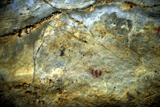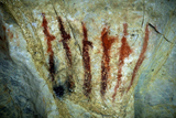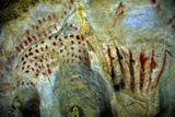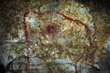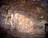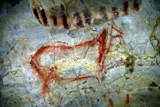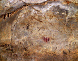 This is a view of the central part of the caveÍs main panel of paintings. It shows a series of dots (PD006), a series of claviforms (PD008), similar to the ones in Cueva de la Cullalvera (Cantabria) and others in L'Ariege(Fontanet), a wounded bison that is painted and engraved (PD009), and a horseÍs head (PD010) facing the previous figure.