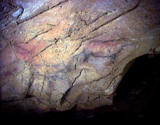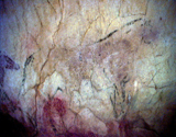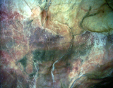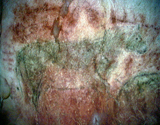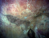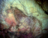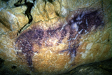 This large figure of a horse facing right is painted in violet. Its conservation is not ideal, as it is affected by calcite formations in the area of its neck and limbs. Its outline is quite diffuse.
