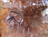 A depiction of a stag outlined in black. No details are shown inside its body. But the long antlers are depicted in slightly twisted perspective, as well as the tail and all four limbs. The rear limbs are arranged in two different planes more effectively than the front ones.