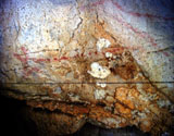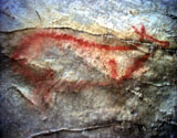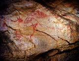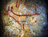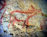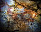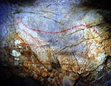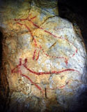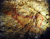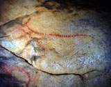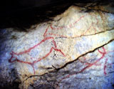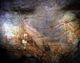 This panel is located at the back of the decorated area, on the right hand wall. Its center is occupied by a large figure of a horse. It is practically whole, with numerous details such as the nostril, eye and mane, depicted with several parallel lines of dots. Also note the hooves on its rear legs, with a rounded shape as usually occurs in pre-Magdalenian art. As many as five small figures of hinds surround the horse. They are less complete figures, normally reduced to the head and the cervical-dorsal line.