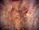 This bison shows some quite archaic pictorial conventions, such as having only one fore and rear limb or the twisted perspective of its horns. Nevertheless, its proportions and numerous details included, like the hooves, genitals, eye, beard and spear in its back, mean this figure is probably of Magdalenian age. Its superimposition on the claviform signs supports this idea.