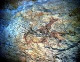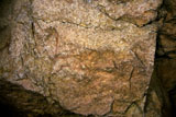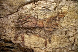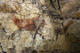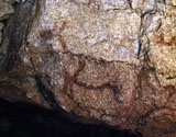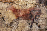 This large figure of a hind facing right was painted in red with different techniques: overlapping dots, continuous lines in its limbs, and color wash in its head and neck. It is a whole figure, with head, V shaped ears, cervical-dorsal line, tail, rear limbs, belly, fore limbs and chest. A figure of a horse facing left (PE011_1J) is painted in front of the hind.