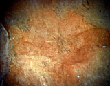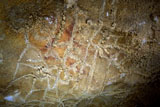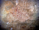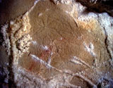 This is a figure of a hind facing right. It is outlined with a line of paint, and filled with a color wash in the same yellowish brown tone. Its head can be seen with two long ears, cervical-dorsal line, belly and chest. But the limbs do not appear to be depicted. This hind is situated between places where part of the wall has fallen off, and patches of calcite. It is paired with another hind facing in the opposite direction (PN003).